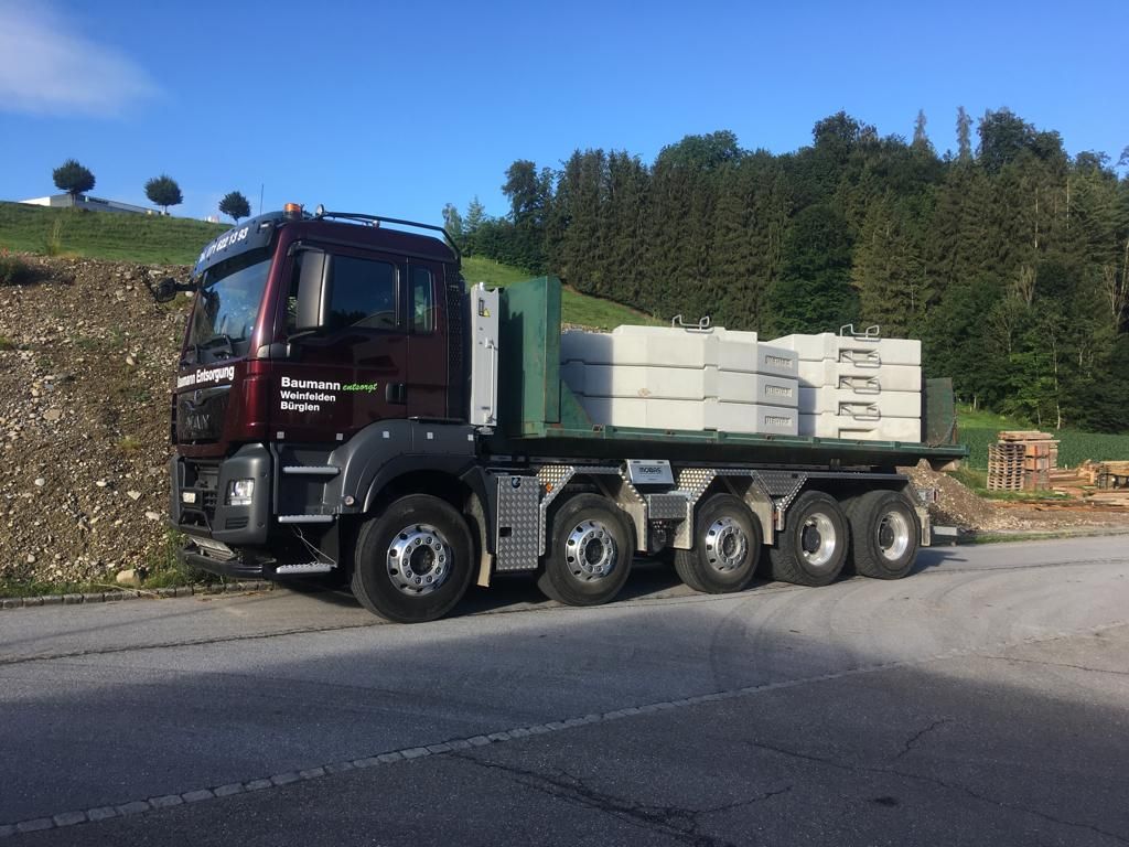 Ob Beton, Steine, Kies, Splitt oder Sand – gerne übernehmen wir für Sie den Transport aller Baumaterialien.